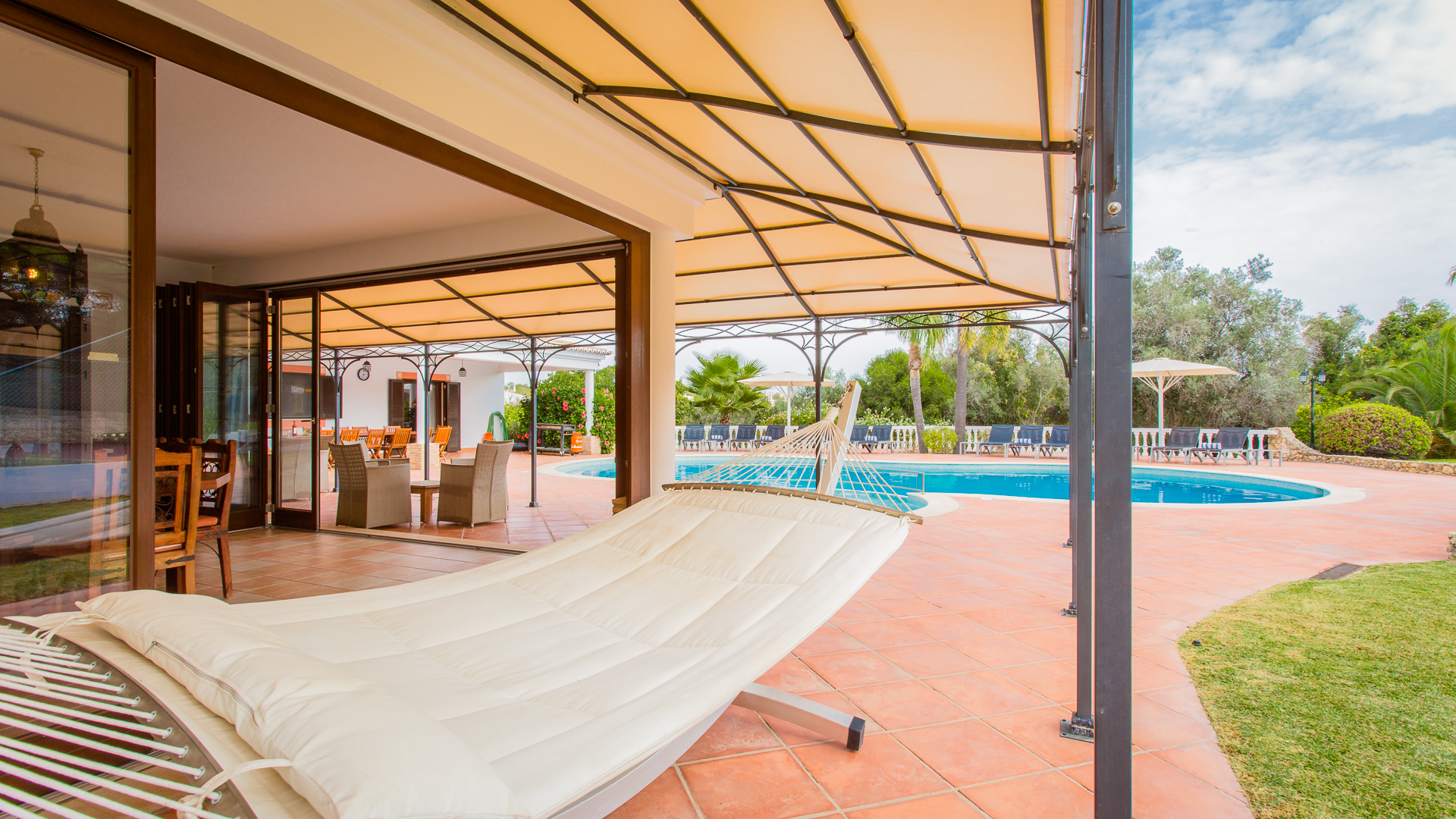 Outside, the figure-eight-shaped, swimming pool (14 x 5m) is incorporated in the terrace and has a small paddling pool. Adjoining the terrace is the private tennis court. The delightful lawned garden has lots of palm trees. There is ample parking space.