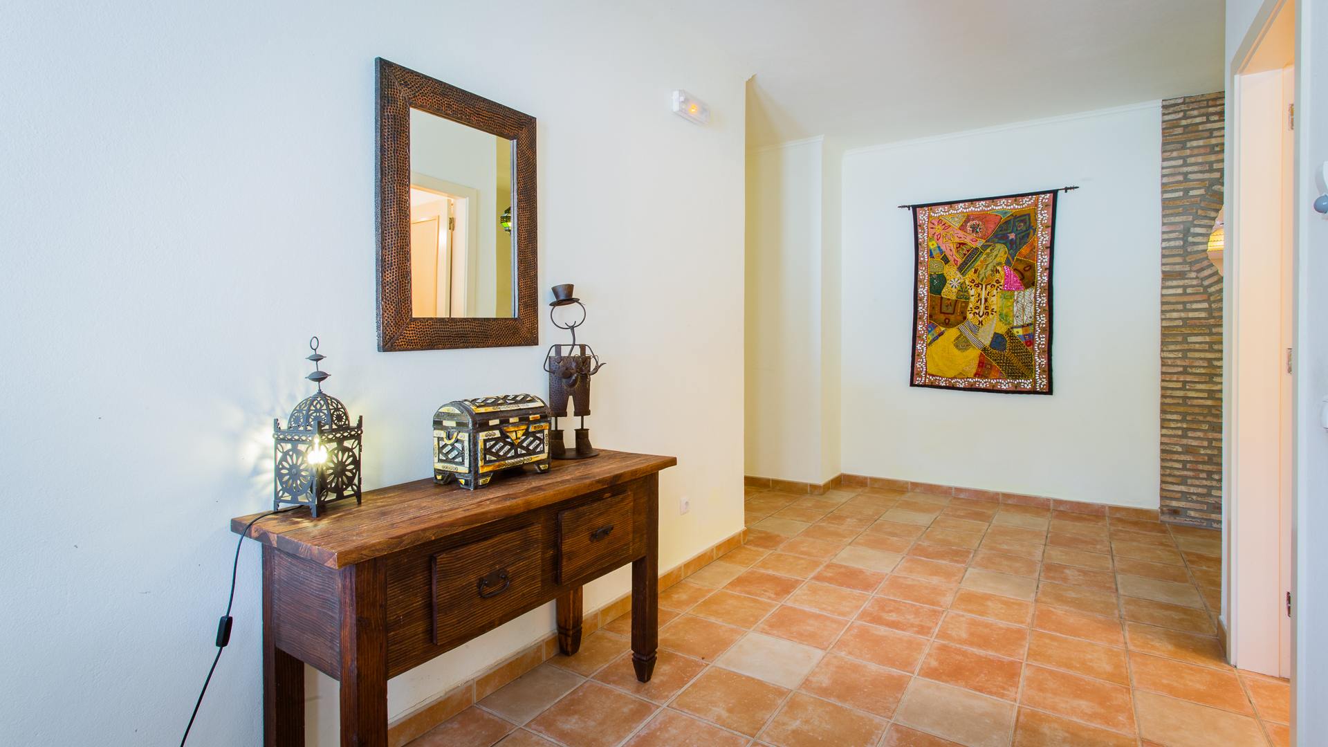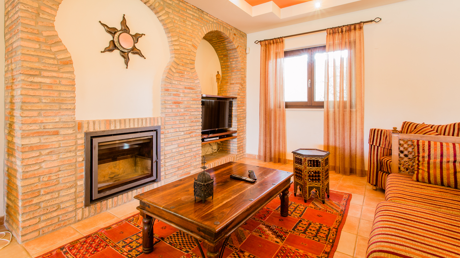 Casa Mouraria is built on two levels: the ground floor and above that, three separate towers, each with its own entrance reached by a flight of stairs. A lovely driveway leads to the main entrance of the villa. The spacious entrance hall opens into the drawing room with comfortable sofas around a fire place and TV set. There is a second sitting area looking out over the garden and the swimming pool. There is a card table with 4 chairs.