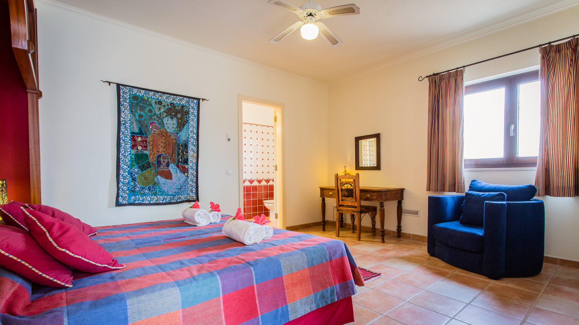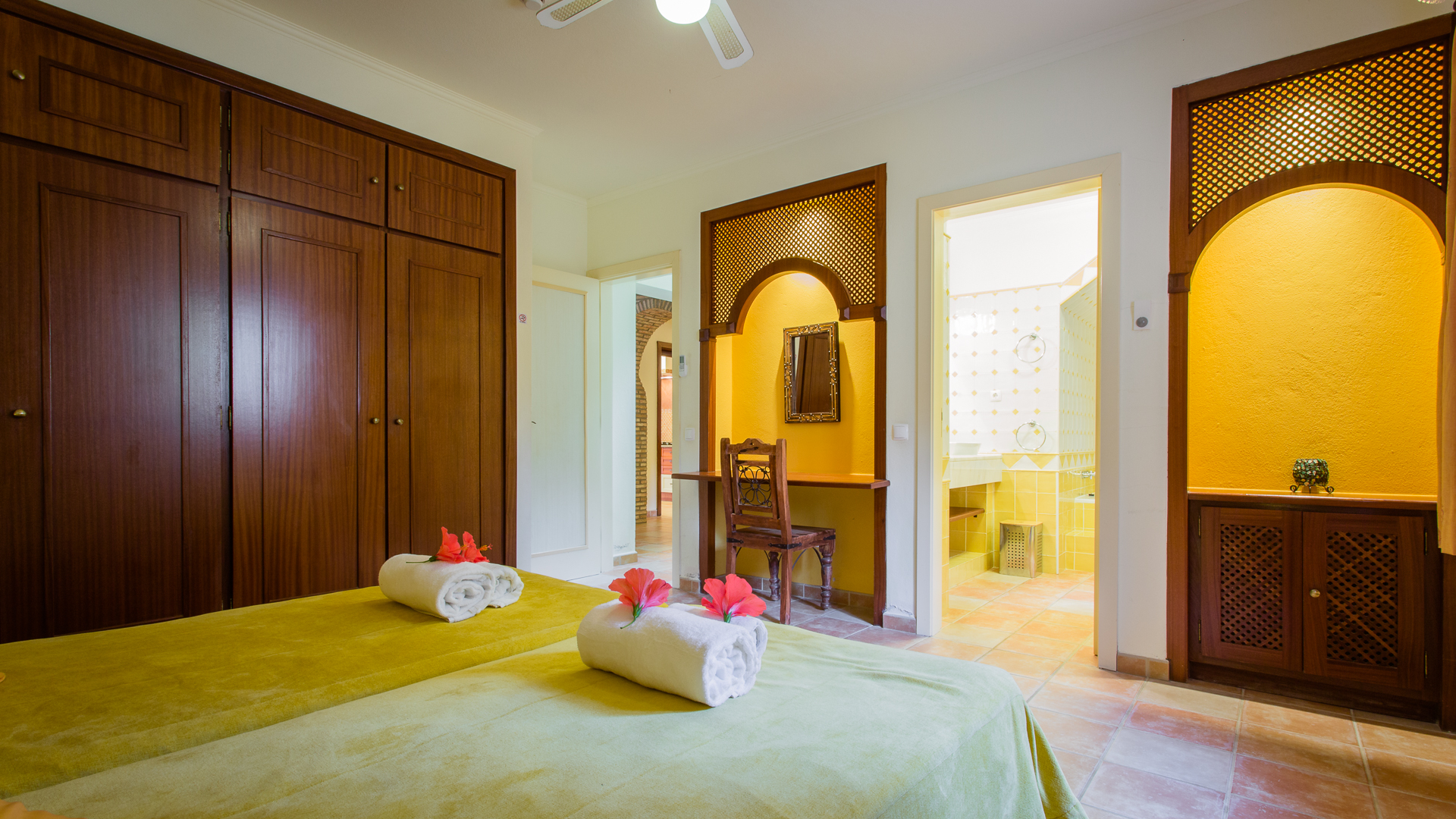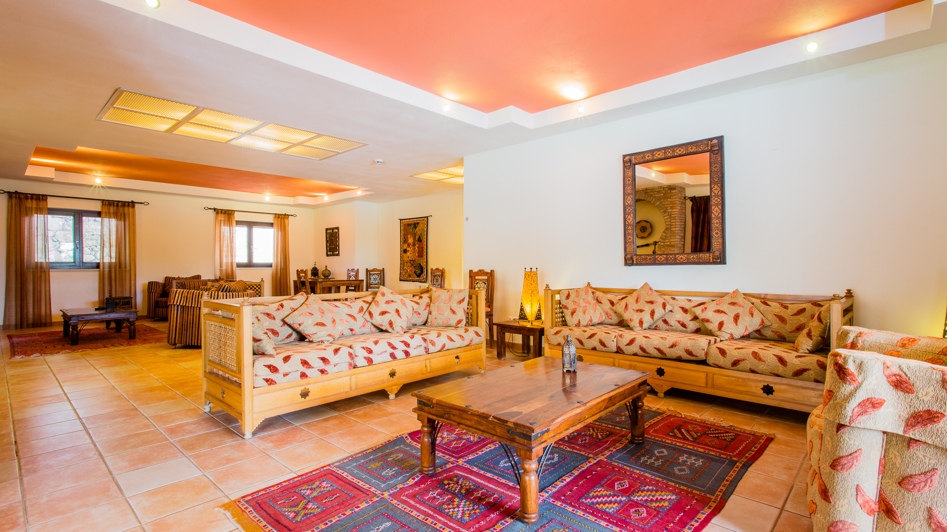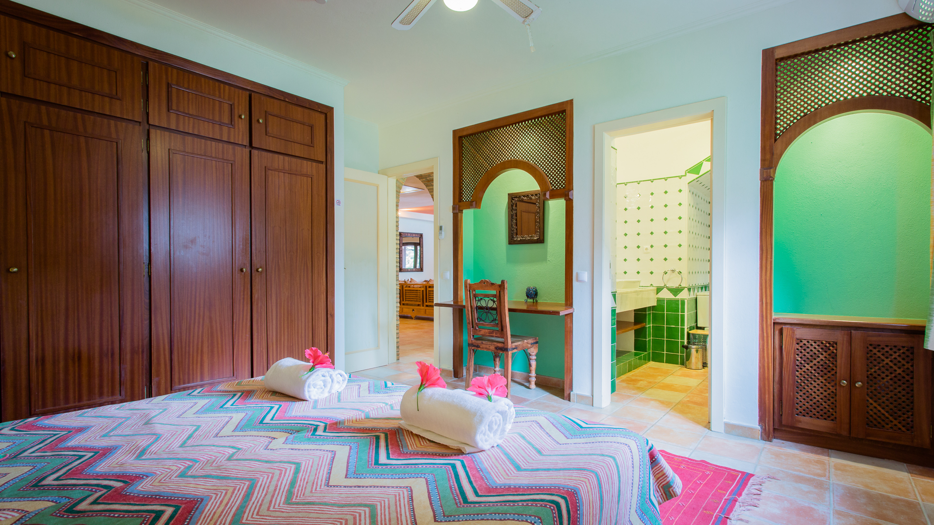 Above the master bedroom on the ground floor there is a tower with a second very large master bedroom with a beautiful ensuite bathroom and a private terrace. The other two towers also have a double bedroom, each with ensuite bathroom and terrace. The tower bedrooms offer maximum privacy. Each bedroom is decorated in a different colour and all are provided with a large ceiling fan as well as air conditioning. The drawing room opens onto the large, partly covered terrace.