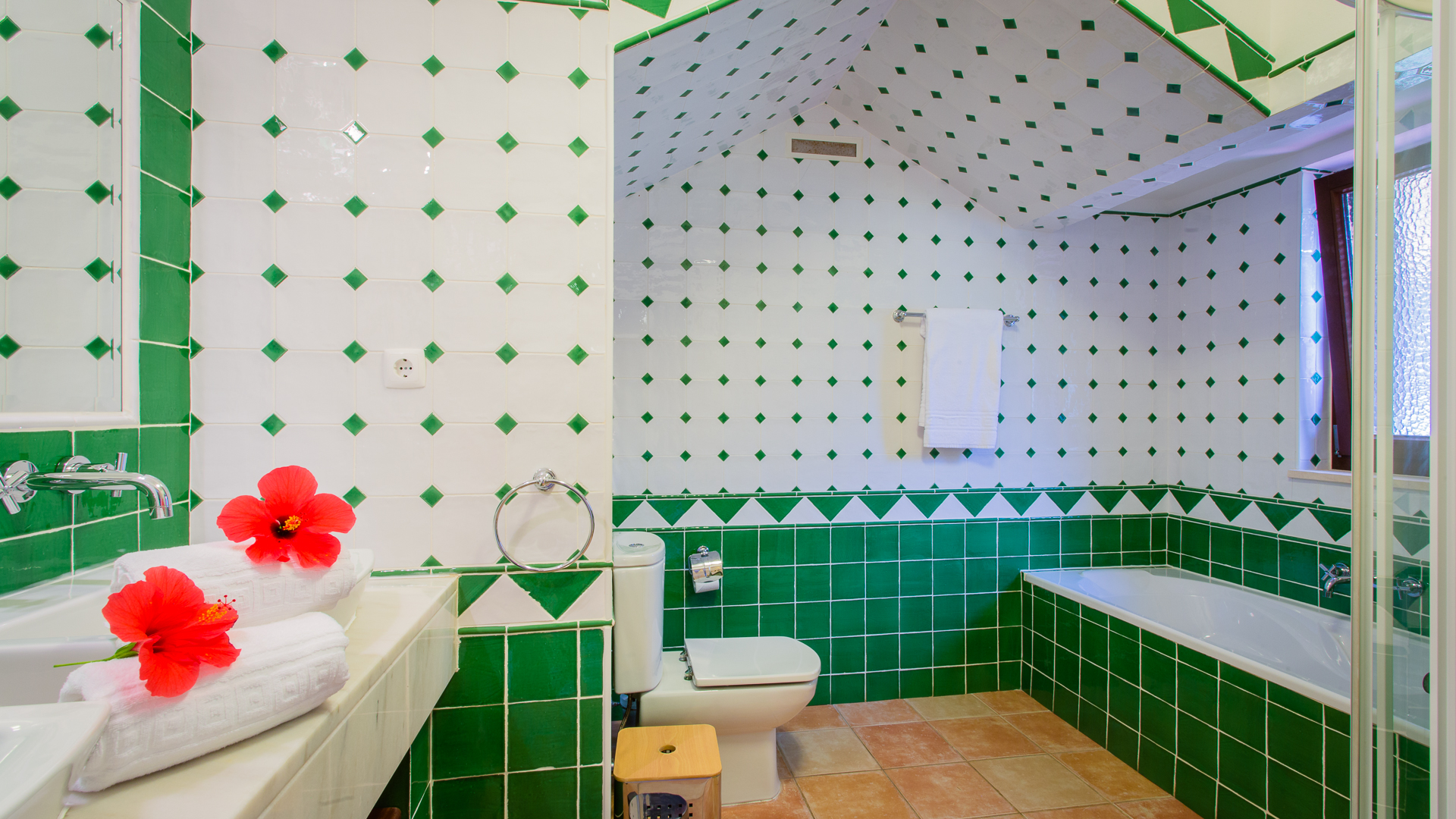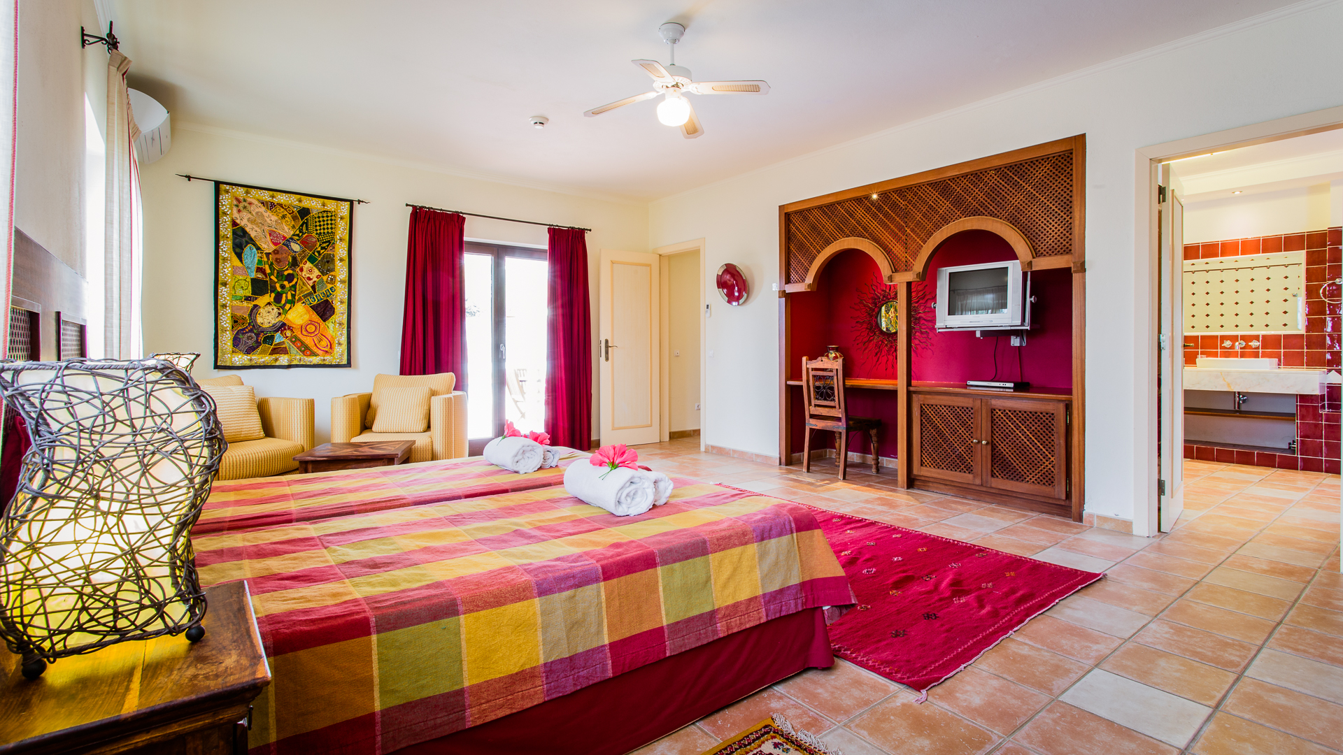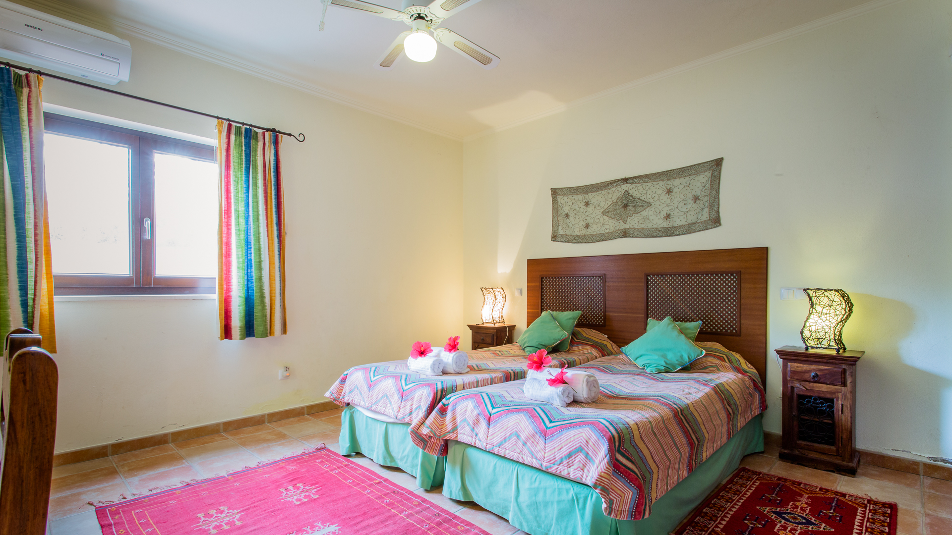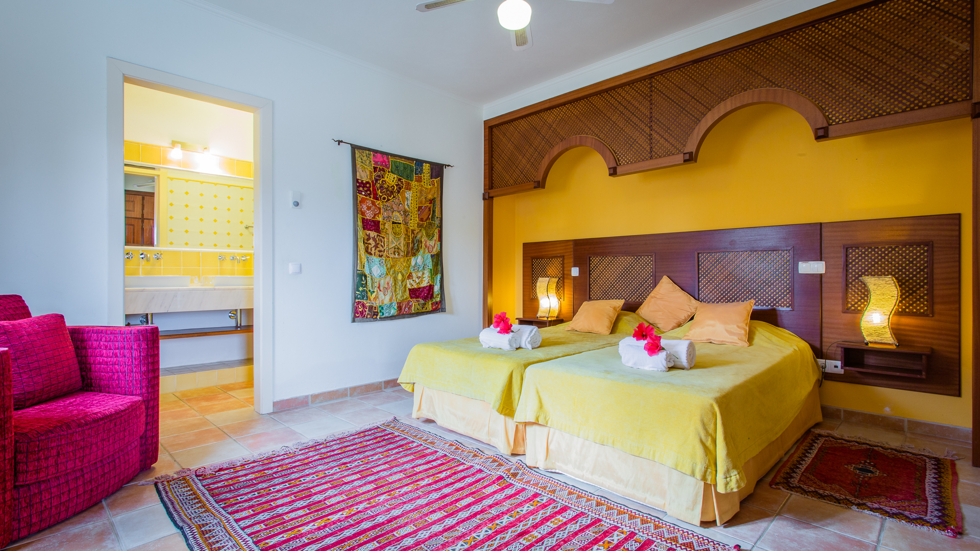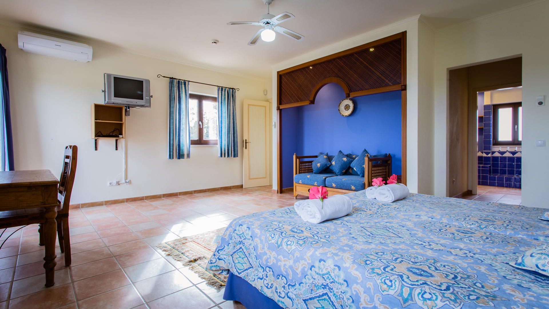 Above the master bedroom on the ground floor there is a tower with a second very large master bedroom with a beautiful ensuite bathroom and a private terrace. The other two towers also have a double bedroom, each with ensuite bathroom and terrace. The tower bedrooms offer maximum privacy. Each bedroom is decorated in a different colour and all are provided with a large ceiling fan as well as air conditioning. The drawing room opens onto the large, partly covered terrace.