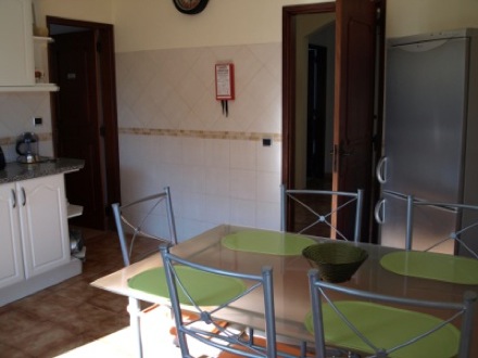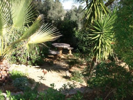 The upstairs part of the villa has a fully equipped kitchen, a beautifully furnished living room with dining area and two full bathrooms with a bath/shower. There is one double, one twin and a third bedroom with three single beds. The living room has patio doors opening onto a shaded veranda with a dining area and a view of the surrounding countryside and garden.